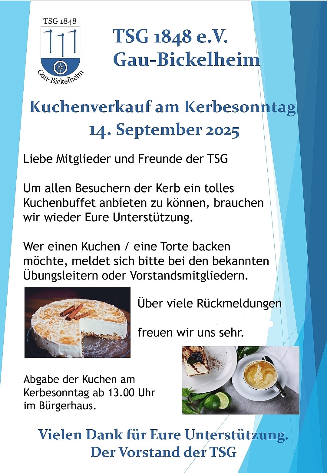 Wer einen Kuchen/Torte backen möchte, meldet sich bitte gerne bei der TSG oder über diesen Kanal.