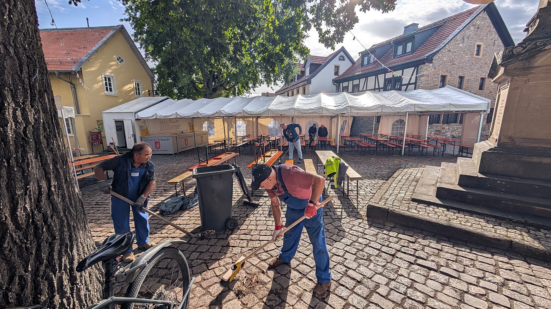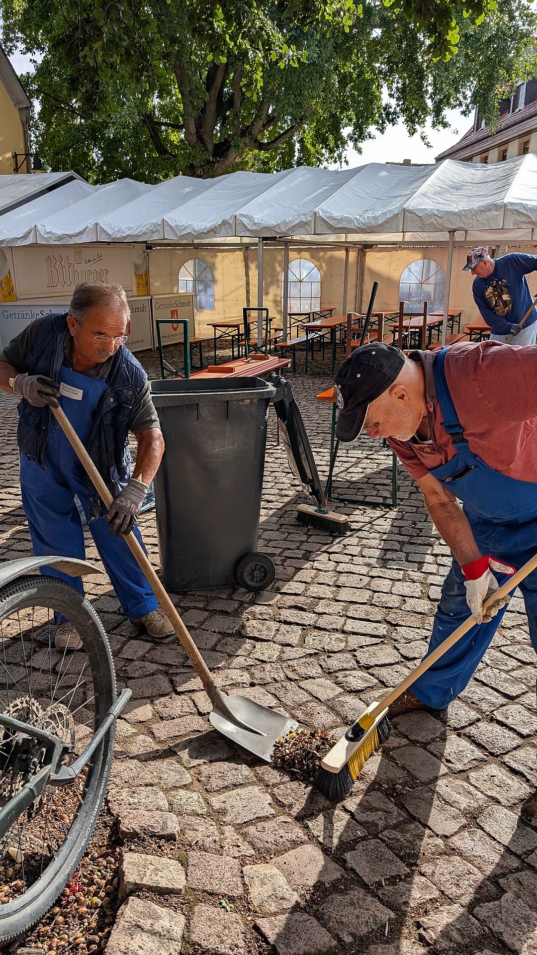 Der erste von 3 Arbeitseinsätzen wurde heute Morgen erfolgreich abgeschlossen. Der Platz wurde komplett gekehrt, die Tische sauber gemacht, Getränke und Leergut sortiert. Der Kerbesamstag kann kommen.