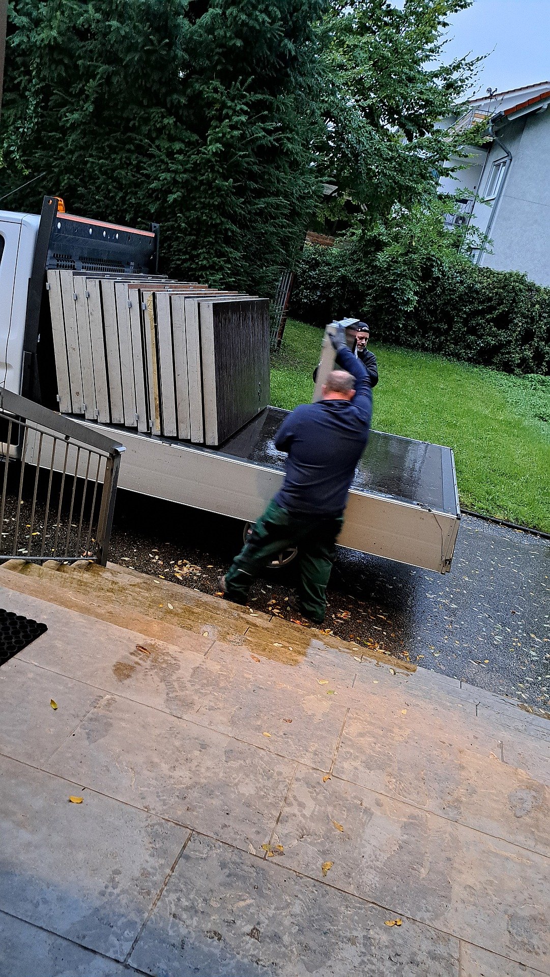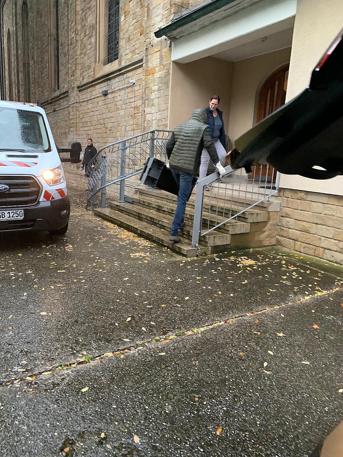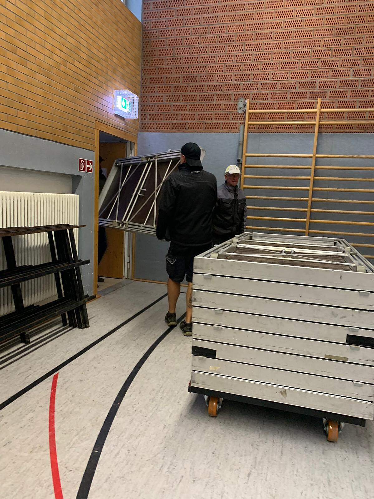 Und auch wenn das Wetter nicht gerade optimal ist, haben fleißige Helfer schon die Bühnenteile und Stepper aus der Turnhalle in die Kirche transportiert.
