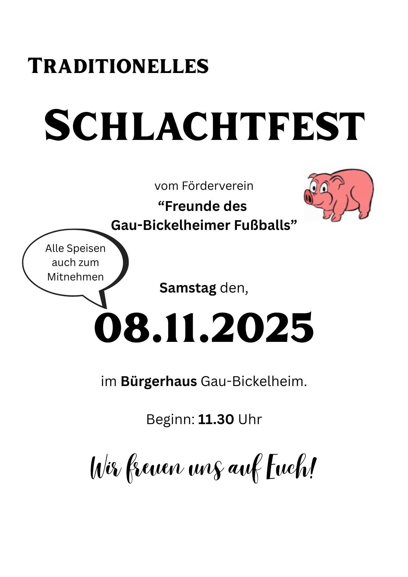 Am Samstag laden wir herzlich zu unserem alljährlichen Schlachtfest im Bürgerhaus ein.