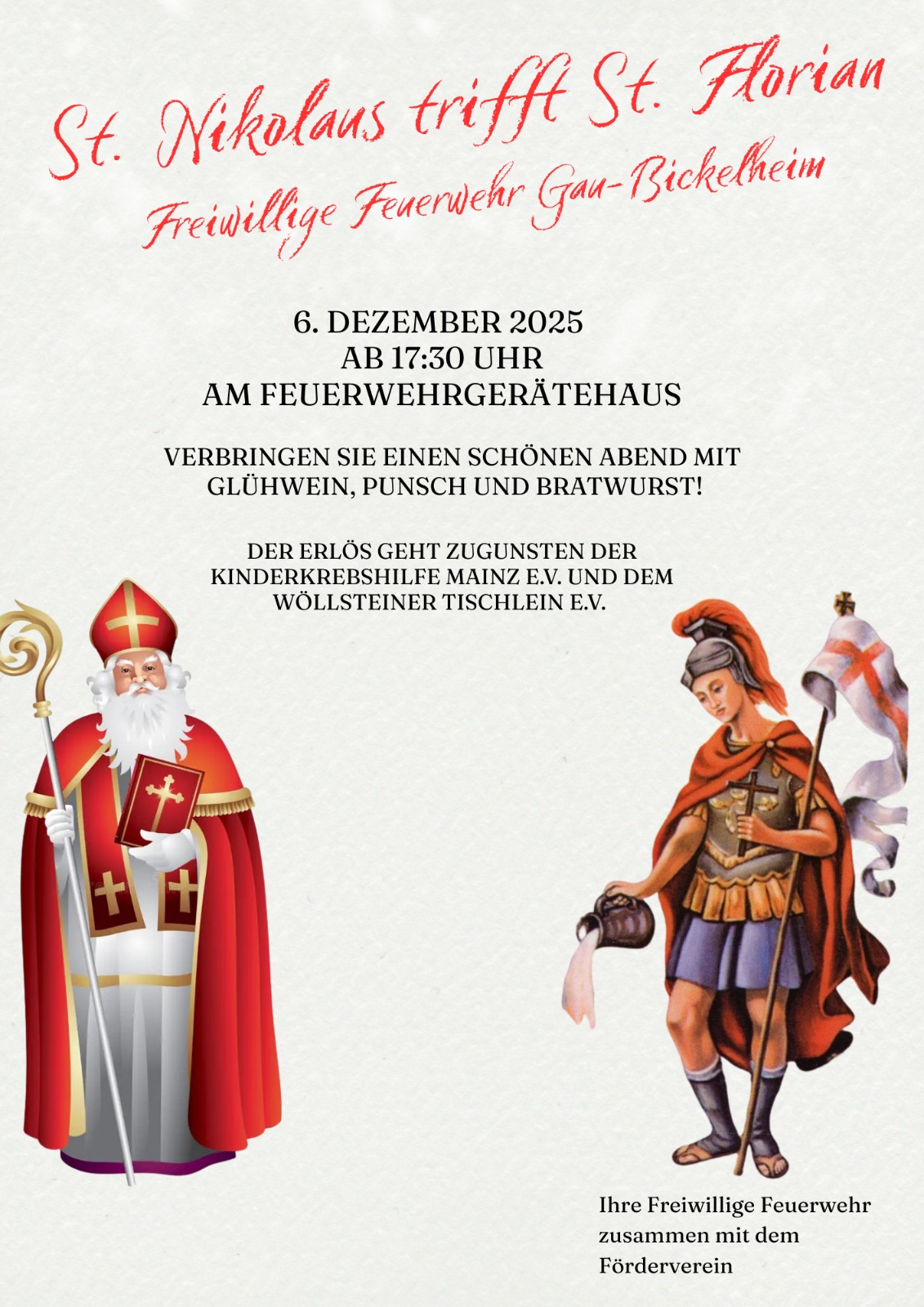 wir laden euch herzlich zu unserer besonderen Spendenveranstaltung ein, die unter dem Motto "St. Nikolaus trifft St. Florian" steht. Die Freiwillige Feuerwehr Gau-Bickelheim möchte mit dieser Aktion die Werte, für die die Schutzpatrone Nikolaus (Hilfsbereitschaft und Nächstenliebe) und Florian (Schutz und Einsatzbereitschaft) stehen, in die Tat umsetzen und Gutes tun.