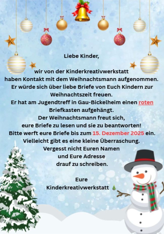 Der Weihnachtsmann freut sich, Eure Briefe zu lesen und auch zu beantworten. Bitte werft Eure Briefe bis zum 15. Dezember 2025 ein.
