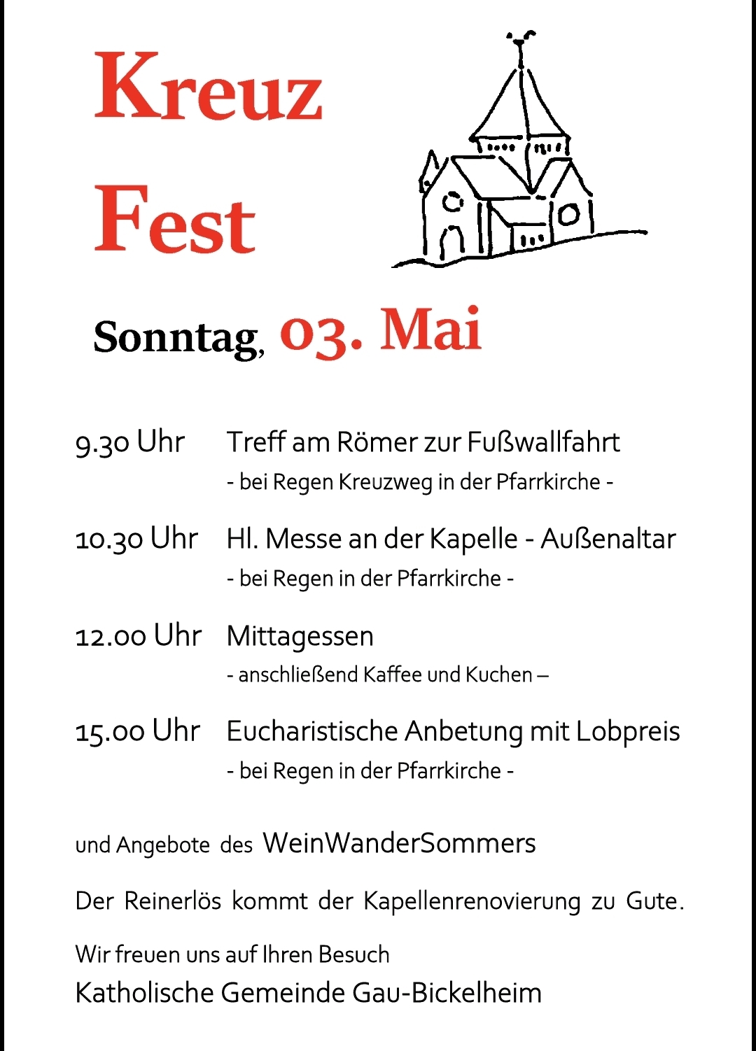 Wir feiern unser Kreuzfest und anschließend laden wir zu Speisen, Getränken, Kaffee und Kuchen ein.