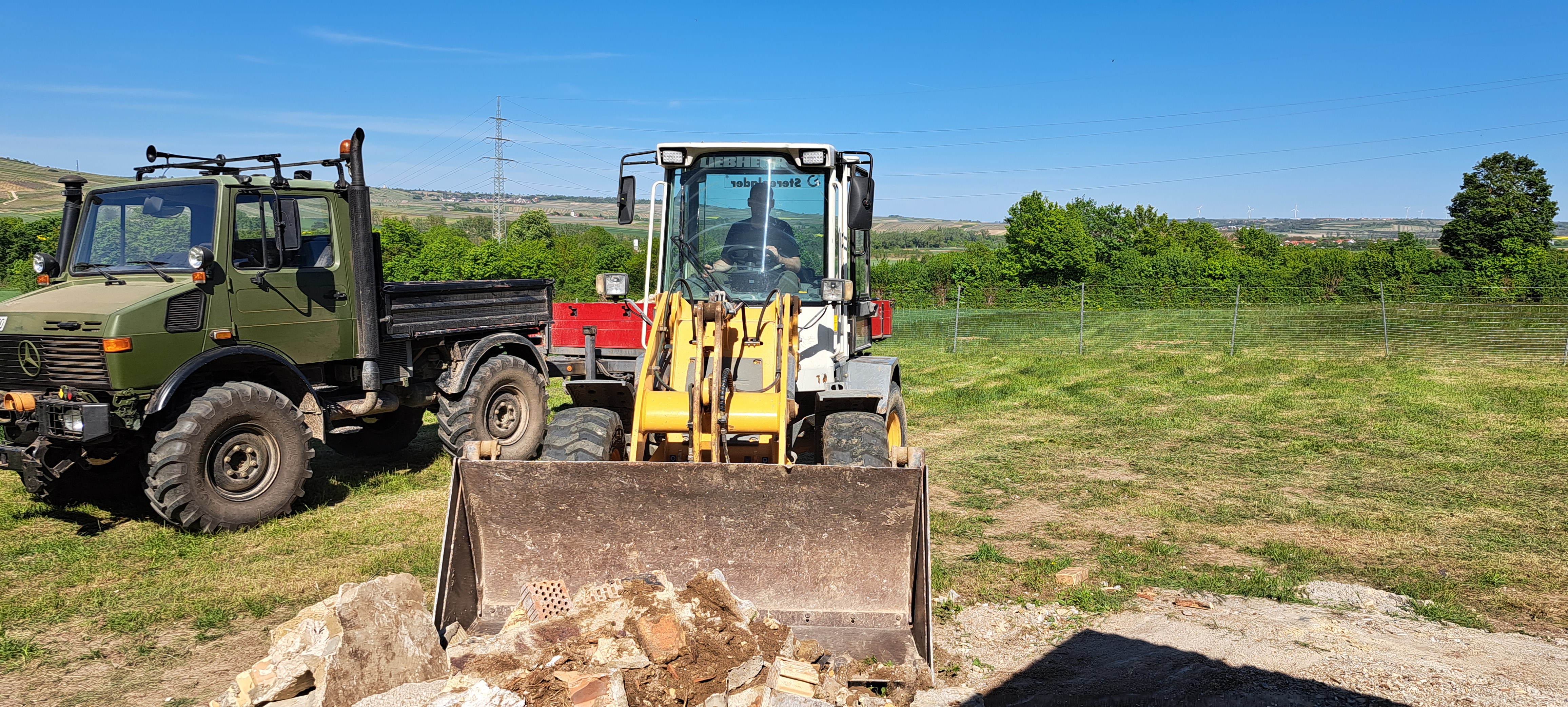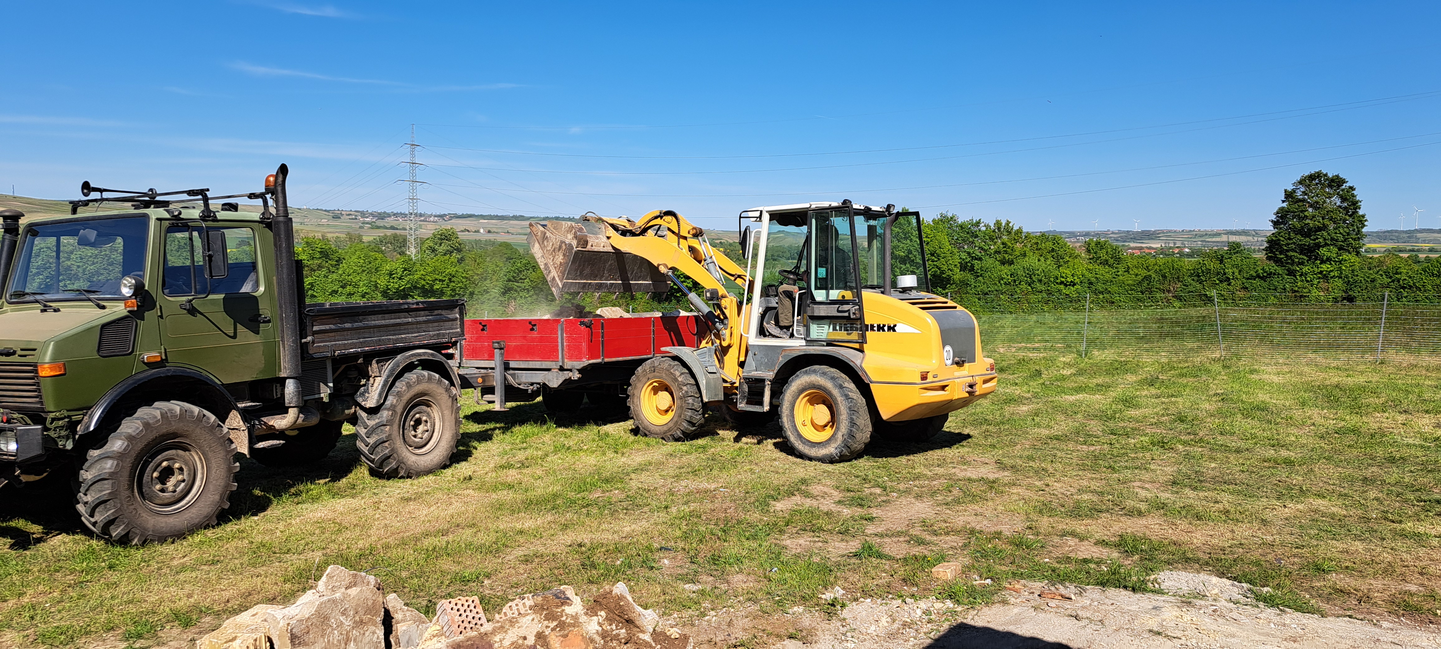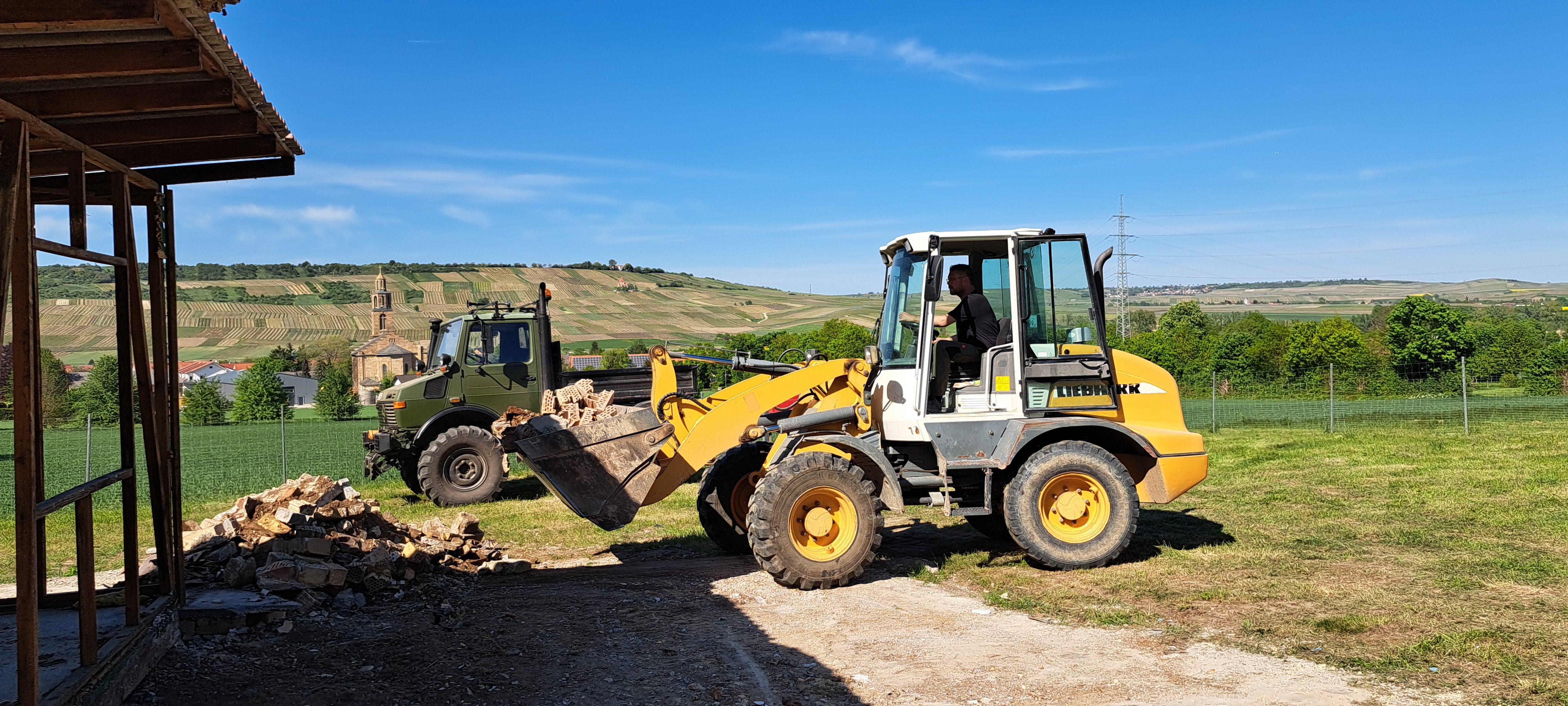 Wir haben Hilfe von unseren Winzern aus dem Ort erhalten, Weingut Krollmann war uns behilflich bei den Pfählen einsetzten und hat uns die gesamte Wiese gemäht. Das Weingut Alfons Schnabel hat uns mit Maschinenpower ,,dem Radlader" die Steine vom Anbau auf einen Anhänger geladen.Der Schutt wurde von Rainer Beck mit seinem ortsbekannten Unimog in 2 Touren nach Frei-Laubersheim in den Steinbruch transportiert. Rainer war uns bei der Entsorgung von Altholz schon behilflich.